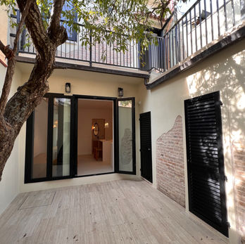 The location has three bedrooms and one and a half bathrooms. The primary bedroom offers balcony access to private outdoors and a Queen bed. The second bedroom has a Queen bed and is light and airy and full of cozy, inviting natural materials and eclectic global art pieces. The third bedroom has a single bed and is decorated in a clean style. All bedrooms feature organic cotton linens. The main bathroom has a walk-in shower and is located on the top floor, the same floor where all the bedrooms are located, and is accessible from the common hallway. The powder room is located on the lower level. The bathrooms are both newly decorated and artfully appointed with cotton towels and all-natural bath products.